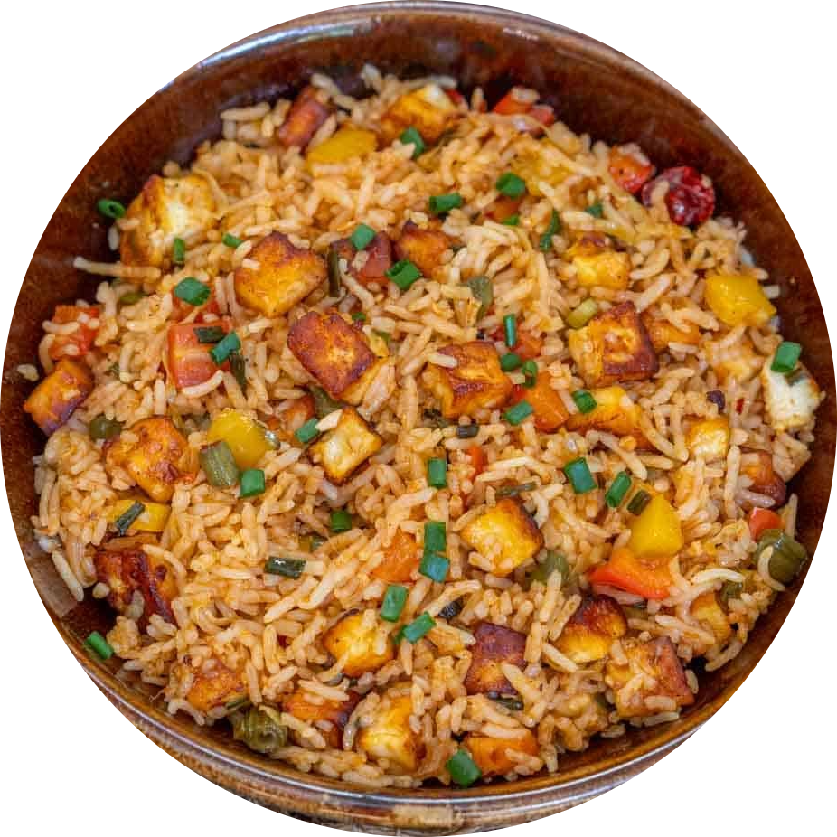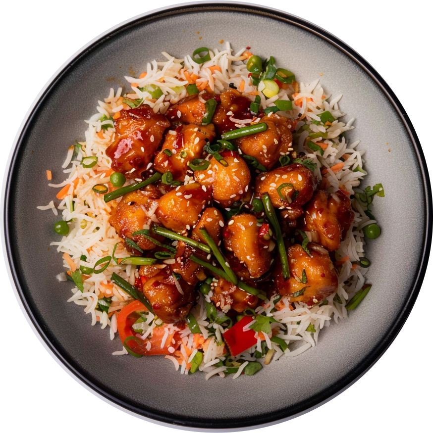 Fried rice tossed with Manchurian flavours, veggies, and sauces.